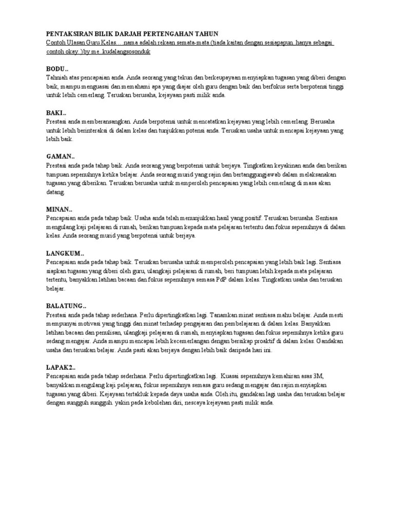 Contoh Ulasan Guru Kelas / Pentaksiran Bilik Darjah Eneraju Pendidikan Negara Bahagian Pembangunan. Contoh ulasan guru untuk pelaporan murid pbd pbs saps azim aris. Contoh ulasan untuk rujukan guru kelas / guru subjek. Lemah dalam penguasaan bahasa inggeris.